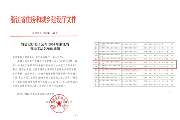 在2024年浙江省省級工法評選中,“富水軟土地質條件下灌注樁高效接樁施工工法”與“基于BIM技術復雜大曲面GRC安裝施工工法”2項工法榮獲浙江省省級工法。